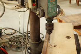 水平ボール盤(縦)材料のダボの穴あけ加工。(材料の平面、小口面)